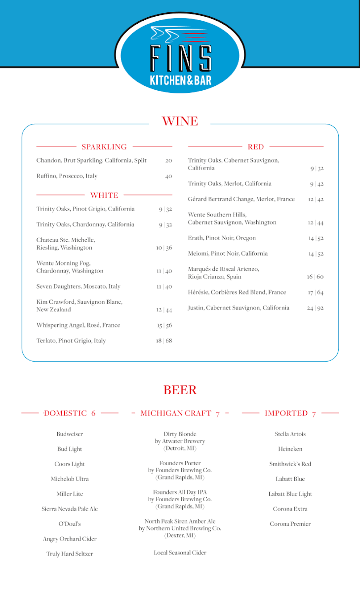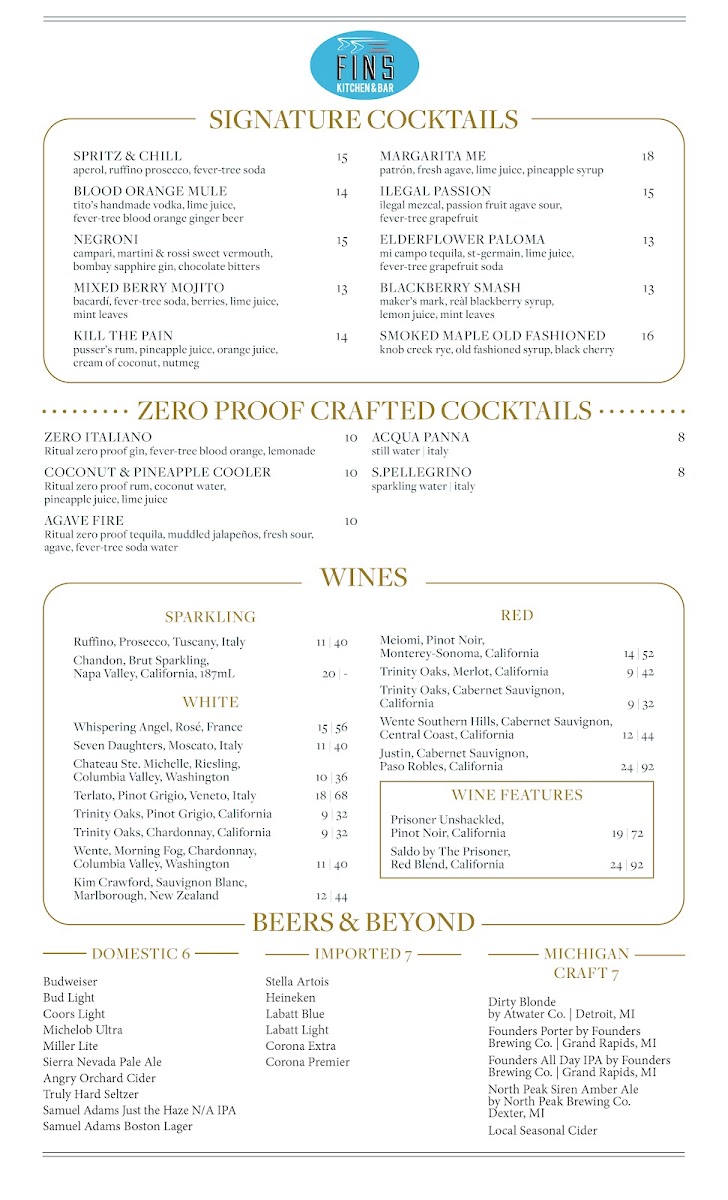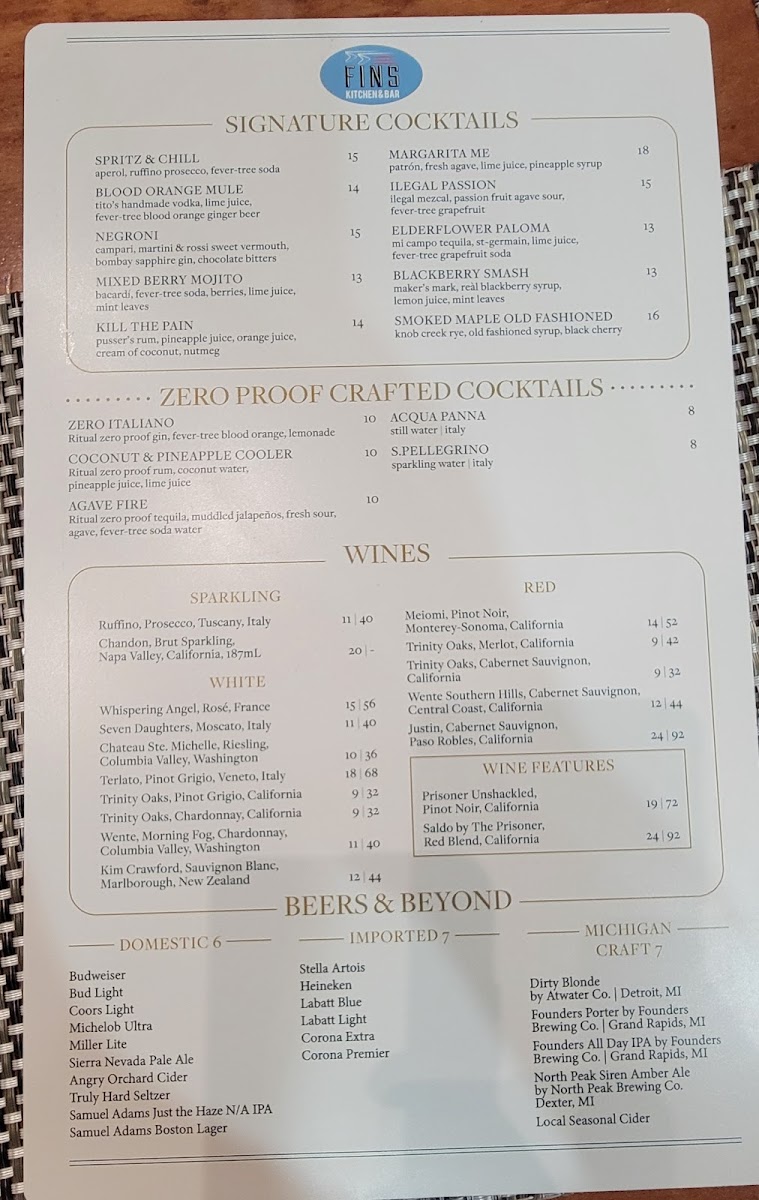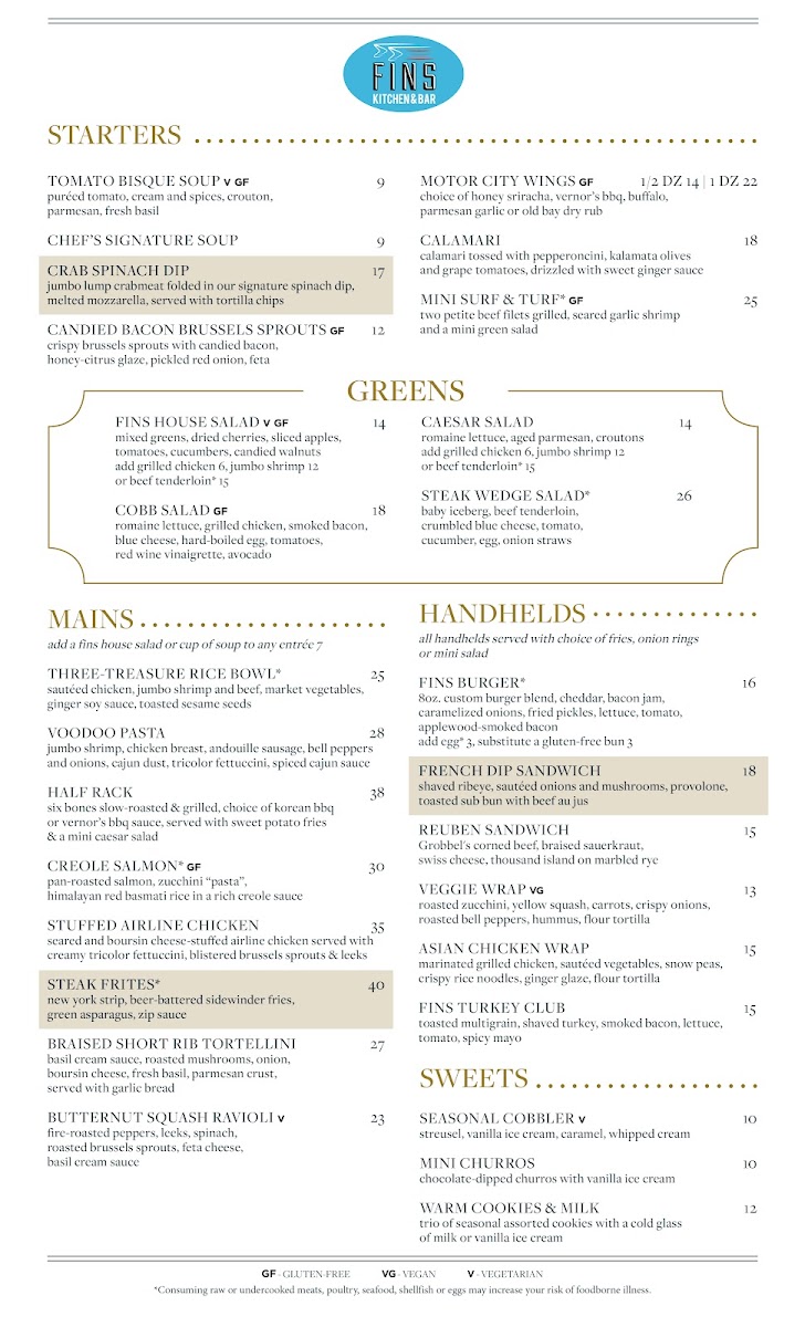 The menu at Fins Kitchen & Bar offers a delightful variety of dishes, making it a great spot for any breakfast or brunch enthusiast. For those seeking something light, you can enjoy the Breakfast Sandwich or opt for the refreshing Continental and OatmealYogurt & Granola Parfait. If you're in the mood for something hearty, the Crunchy French Toast and Classic French Toast are satisfying choices, alongside the indulgent Pancakes and the comforting Biscuits & Gravy. Among the restaurant's favorites, the All-American Breakfast and Motor City Mixed Grill stand out, with other notable dishes like Grobbel's of Detroit Corned Beef Hash, Eggs Benedict, and the energizing Sunrise Power Bowl. The Fins Kitchen Sink Omelet offers a flavorful mix, while the Vegetable and Mediterranean Egg White omelets cater to lighter tastes. To accompany your meal, a variety of beverages are available, including Orange Juice, Cranberry, Apple, or Tomato Juice, along with Coffee, Hot Tea, Hot Chocolate, and refreshing options like Lemonade or Iced Tea. The Breakfast Buffet is also a great option for those who want to sample a little bit of everything. With such a diverse and appealing selection, Fins Kitchen & Bar has something to satisfy every palate.