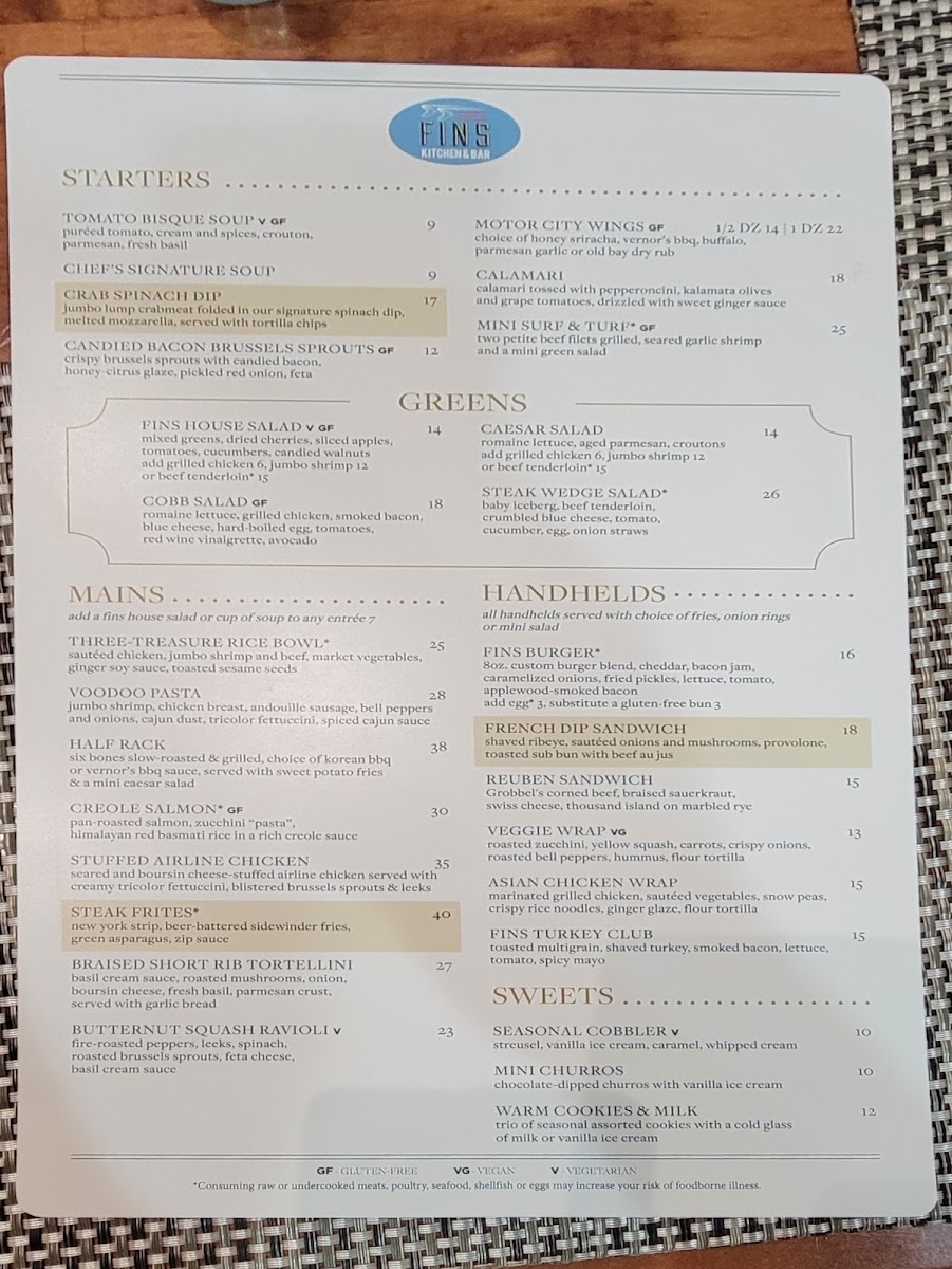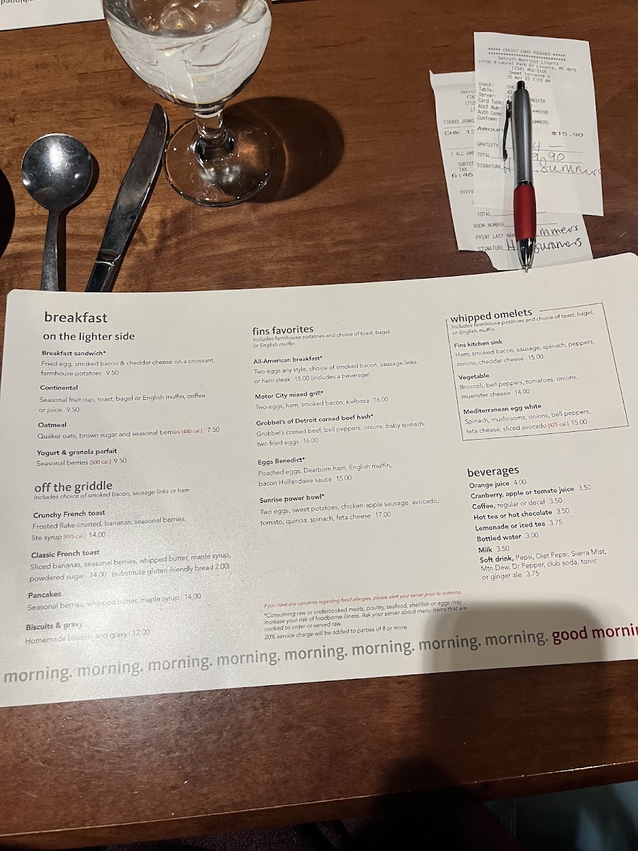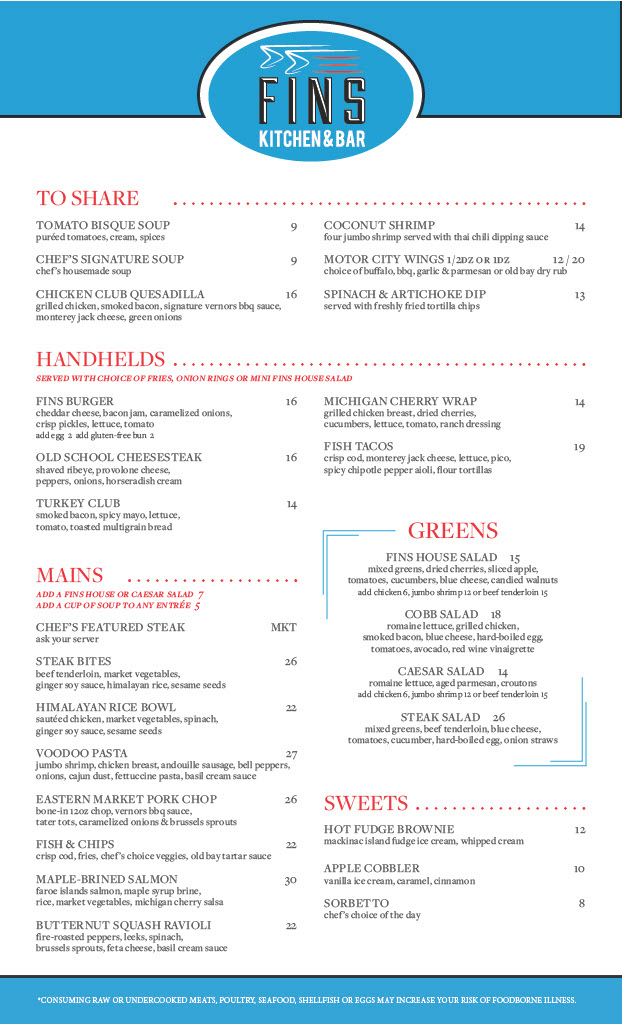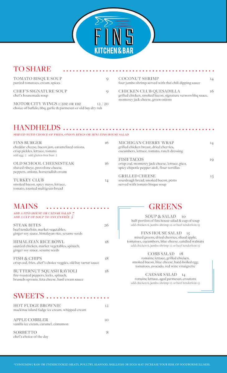 The menu at Fins Kitchen & Bar offers a delightful variety of dishes, making it a great spot for any breakfast or brunch enthusiast. For those seeking something light, you can enjoy the Breakfast Sandwich or opt for the refreshing Continental and OatmealYogurt & Granola Parfait. If you're in the mood for something hearty, the Crunchy French Toast and Classic French Toast are satisfying choices, alongside the indulgent Pancakes and the comforting Biscuits & Gravy. Among the restaurant's favorites, the All-American Breakfast and Motor City Mixed Grill stand out, with other notable dishes like Grobbel's of Detroit Corned Beef Hash, Eggs Benedict, and the energizing Sunrise Power Bowl. The Fins Kitchen Sink Omelet offers a flavorful mix, while the Vegetable and Mediterranean Egg White omelets cater to lighter tastes. To accompany your meal, a variety of beverages are available, including Orange Juice, Cranberry, Apple, or Tomato Juice, along with Coffee, Hot Tea, Hot Chocolate, and refreshing options like Lemonade or Iced Tea. The Breakfast Buffet is also a great option for those who want to sample a little bit of everything. With such a diverse and appealing selection, Fins Kitchen & Bar has something to satisfy every palate.